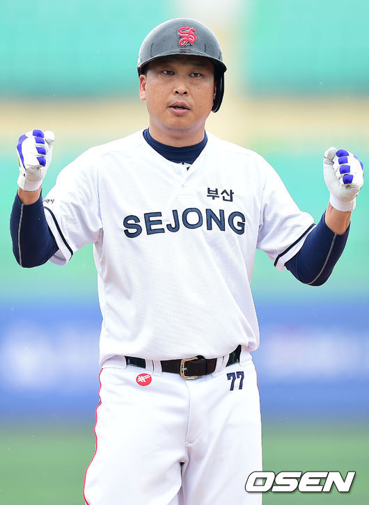 24일 전라북도 군산시 사정동 월명야구장에서 열린 제1회 KBO총재배 시도대항 전국 직장인 야구대회 결승전 부산 세종공업과 전북 세아베스틸의 경기,2회초 1사 주자 만루 세종공업 심재훈이 역전 2타점 적시타를 날린 후 1루에서 기뻐하고 있다.