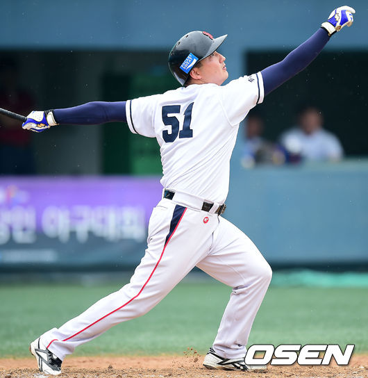 24일 전라북도 군산시 사정동 월명야구장에서 열린 제1회 KBO총재배 시도대항 전국 직장인 야구대회 결승전 부산 세종공업과 전북 세아베스틸의 경기,2회초 1사 주자 1,3루 세종공업 박찬수가 1타점 희생타를 날리고 있다.