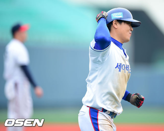 24일 전라북도 군산시 사정동 월명야구장에서 열린 제1회 KBO총재배 시도대항 전국 직장인 야구대회 결승전 부산 세종공업과 전북 세아베스틸의 경기, 2회말 1사 주자 1,3루 세아베스틸 김희철이 좌월 스리런 홈런을 날린 후 그라운드를 돌며 기뻐하고 있다.