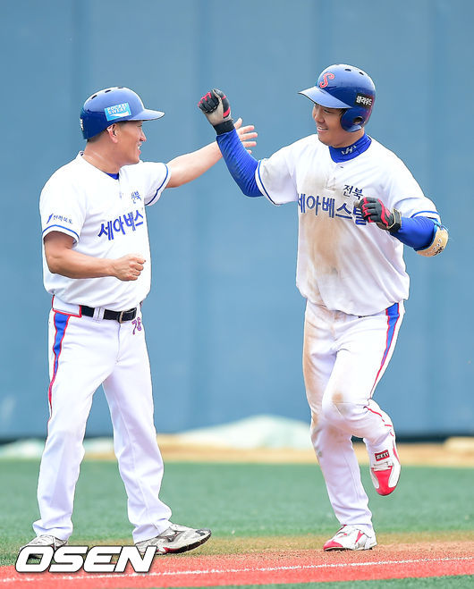 24일 전라북도 군산시 사정동 월명야구장에서 열린 제1회 KBO총재배 시도대항 전국 직장인 야구대회 결승전 부산 세종공업과 전북 세아베스틸의 경기, 2회말 1사 주자 1,3루 세아베스틸 김희철이 좌월 스리런 홈런을 날린 후 그라운드를 돌며 기뻐하고 있다.