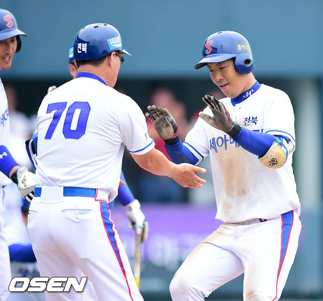 24일 전라북도 군산시 사정동 월명야구장에서 열린 제1회 KBO총재배 시도대항 전국 직장인 야구대회 결승전 부산 세종공업과 전북 세아베스틸의 경기, 2회말 1사 주자 1,3루 세아베스틸 김희철이 좌월 스리런 홈런을 날린 후 홈에서 기뻐하고 있다.