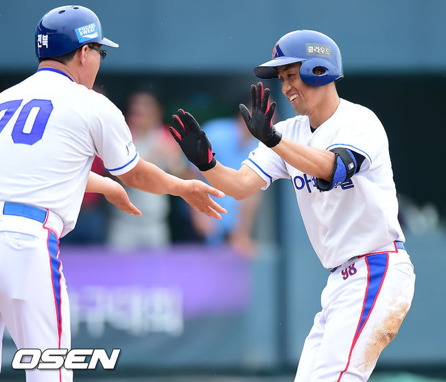 24일 전라북도 군산시 사정동 월명야구장에서 열린 제1회 KBO총재배 시도대항 전국 직장인 야구대회 결승전 부산 세종공업과 전북 세아베스틸의 경기, 2회말 1사 주자 1루 세아베스틸 문용두가 좌월 투런 홈런을 날린 후 홈에서 기뻐하고 있다.