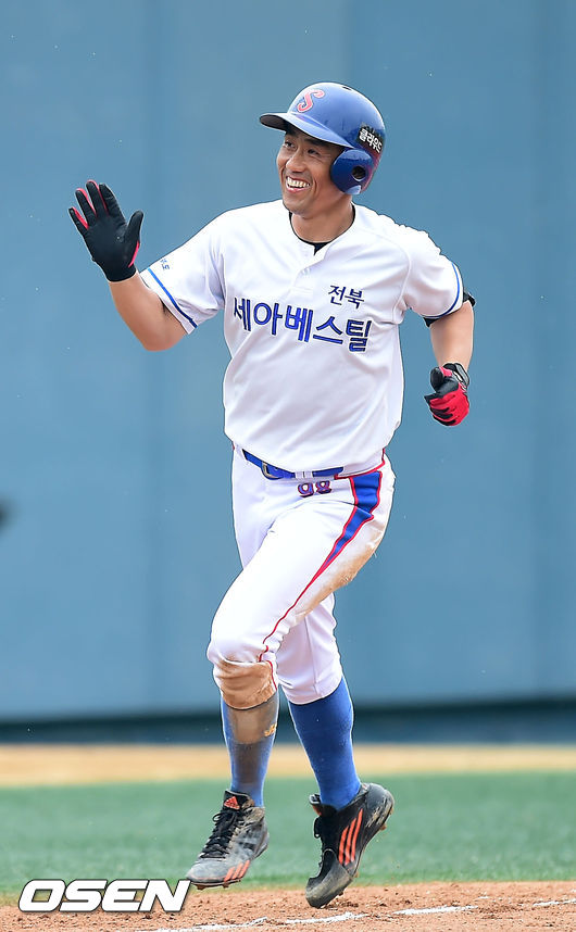 23일 전라북도 군산시 사정동 월명야구장에서 열린 제1회 KBO총재배 시도대항 전국 직장인 야구대회 결승전 부산 세종공업과 전북 세아베스틸의 경기, 2회말 1사 주자 1루 세아베스틸 문용두가 좌월 투런 홈런을 날린 후 그라운드를 돌고 있다.