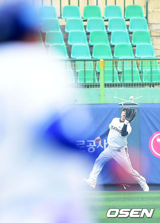 24일 전라북도 군산시 사정동 월명야구장에서 열린 제1회 KBO총재배 시도대항 전국 직장인 야구대회 결승전 부산 세종공업과 전북 세아베스틸의 경기, 5회말 2사 주자 2,3루 세아베스틸 조광현의 타구를 세종공업 좌익수 이원영이 달려나오며 잡아내고 있다.