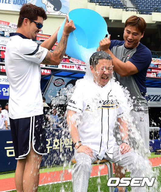 24일 오후 서울 잠실야구장에서 열린 '2014 한국야쿠르트 세븐 프로야구' 두산 베어스와 NC 다이노스의 경기, 경기에 앞서 두산 박정원 구단주가 홍성흔, 오재원의 도움을 받아 아이스버킷챌린지를 하고 있다.