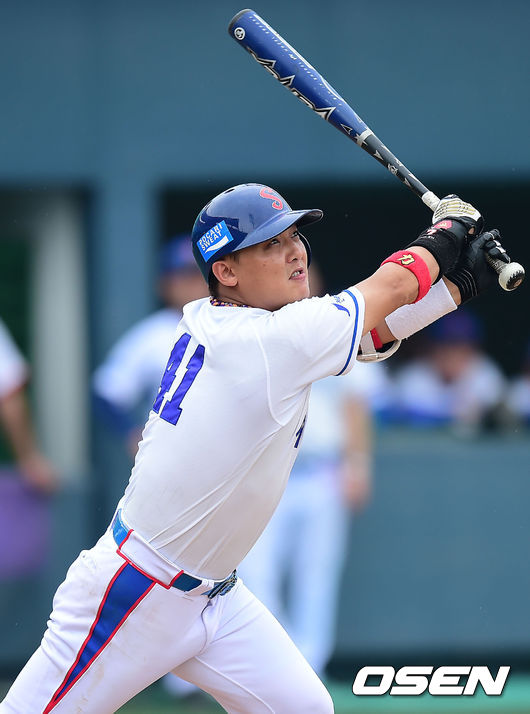 24일 전라북도 군산시 사정동 월명야구장에서 열린 제1회 KBO총재배 시도대항 전국 직장인 야구대회 결승전 부산 세종공업과 전북 세아베스틸의 경기, 7회말 1사 주자 만루 세아베스틸 유민수가 좌익수 희생플라이를 날리며 1타점을 올리고 있다.