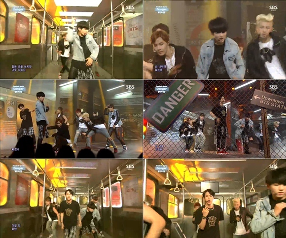 방탄소년단은 24일 오후 방송된 SBS 음악방송 '인기가요'에 출연해 신곡 '댄저' 무대를 공개했다.