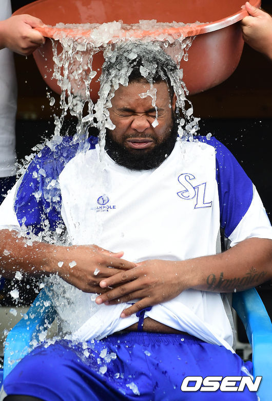 24일 오후 대구 시민구장에서 열리는 '2014 한국야쿠르트 세븐 프로야구' 삼성 라이온즈와 SK 와이번스의 경기 시작전 나바로가 아이스버킷챌린지에 동참하고 있다. 나바로는 박석민으로부터 지목을 받은 바 있다.