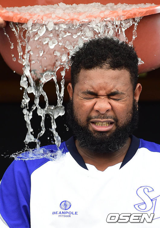 24일 오후 대구 시민구장에서 열리는 '2014 한국야쿠르트 세븐 프로야구' 삼성 라이온즈와 SK 와이번스의 경기 시작전 나바로가 아이스버킷챌린지에 동참하고 있다. 나바로는 박석민으로부터 지목을 받은 바 있다.