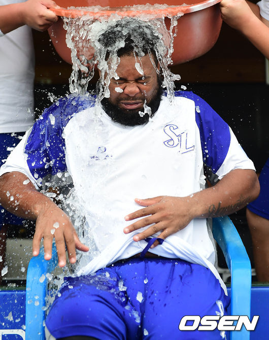 24일 오후 대구 시민구장에서 열리는 '2014 한국야쿠르트 세븐 프로야구' 삼성 라이온즈와 SK 와이번스의 경기 시작전 나바로가 아이스버킷챌린지에 동참하고 있다. 나바로는 박석민으로부터 지목을 받은 바 있다.