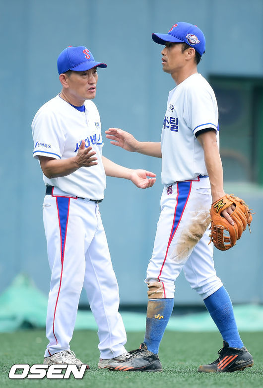 24일 전라북도 군산시 사정동 월명야구장에서 열린 제1회 KBO총재배 시도대항 전국 직장인 야구대회 결승전 부산 세종공업과 전북 세아베스틸의 경기, 8회초 세아베스틸 문용두가 삼자범퇴로 막아낸 후 덕아웃에서 최광웅 감독과 하이파이브를 하고 있다.