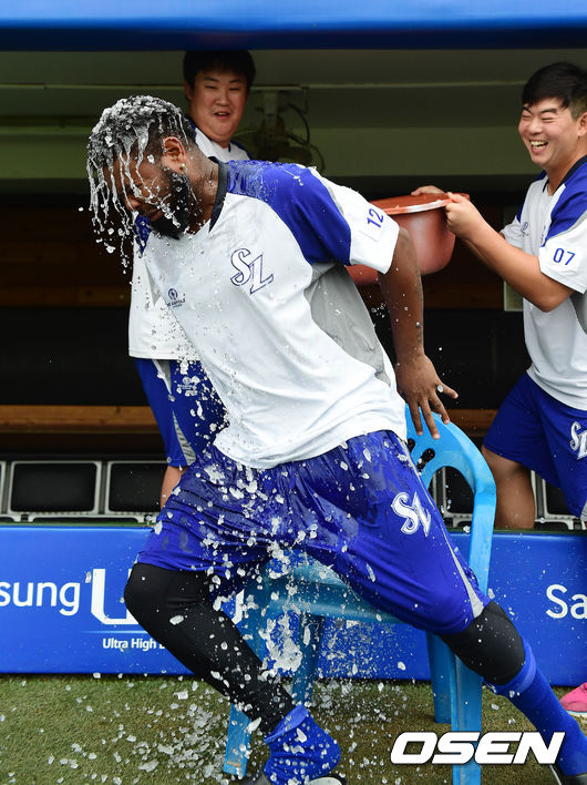 24일 오후 대구 시민구장에서 열리는 '2014 한국야쿠르트 세븐 프로야구' 삼성 라이온즈와 SK 와이번스의 경기 시작전 나바로가 아이스버킷챌린지에 동참하는 중 자리를 박차고 뛰어가고 있다. 나바로는 박석민으로부터 지목을 받은 바 있다.