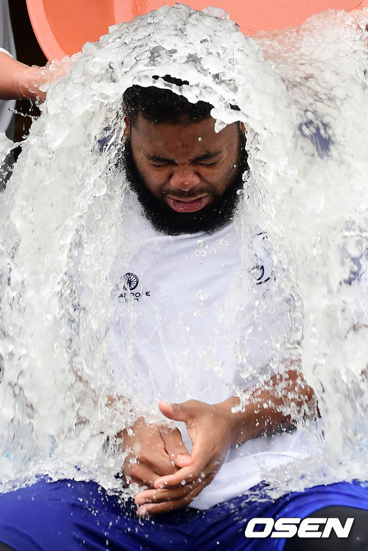 24일 오후 대구 시민구장에서 열리는 '2014 한국야쿠르트 세븐 프로야구' 삼성 라이온즈와 SK 와이번스의 경기 시작전 나바로가 아이스버킷챌린지에 동참하고 있다. 나바로는 박석민으로부터 지목을 받은 바 있다.
