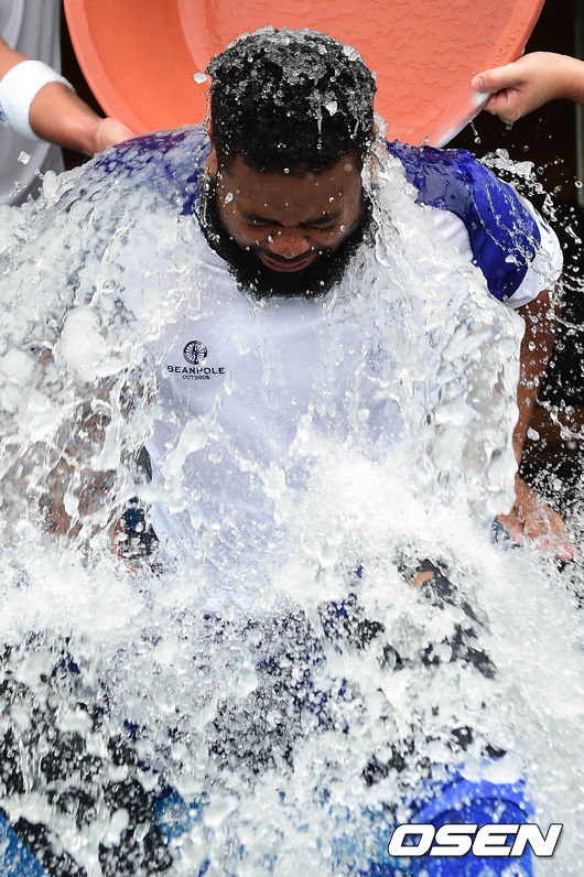 24일 오후 대구 시민구장에서 열리는 '2014 한국야쿠르트 세븐 프로야구' 삼성 라이온즈와 SK 와이번스의 경기 시작전 나바로가 아이스버킷챌린지에 동참하고 있다. 나바로는 박석민으로부터 지목을 받은 바 있다.
