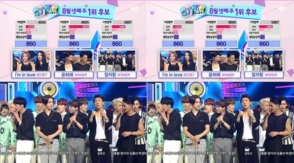 위너는 24일 오후 방송된 SBS 음악방송 '인기가요'에서 데뷔곡 '공허해'로 1위에 올랐다.