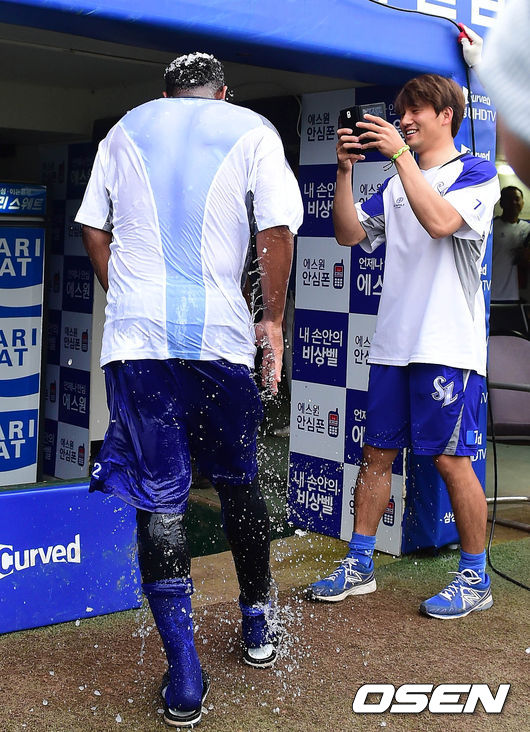 24일 오후 대구 시민구장에서 열리는 '2014 한국야쿠르트 세븐 프로야구' 삼성 라이온즈와 SK 와이번스의 경기 시작전 나바로가 아이스버킷챌린지에 동참한 후 덕아웃으로 향하고 있다. 나바로는 박석민으로부터 지목을 받은 바 있다.