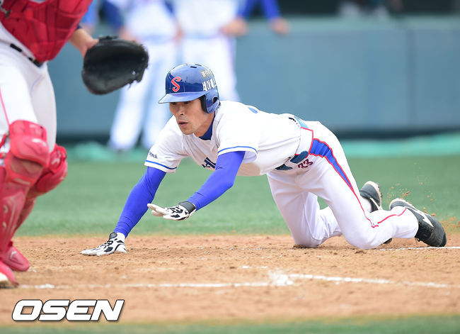 24일 전라북도 군산시 사정동 월명야구장에서 열린 제1회 KBO총재배 시도대항 전국 직장인 야구대회 결승전 부산 세종공업과 전북 세아베스틸의 경기, 8회말 세아베스틸 1사 주자 1,3루 대타 국중문이 중전 안타를 날린 후 홈으로 몸을 날려 그라운드홈런을 기록하고 있다.
