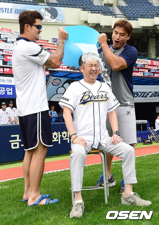 24일 오후 서울 잠실야구장에서 열린 '2014 한국야쿠르트 세븐 프로야구' 두산 베어스와 NC 다이노스의 경기, 경기에 앞서 두산 박정원 구단주가 홍성흔, 오재원의 도움을 받아 아이스버킷챌린지를 하고 있다.