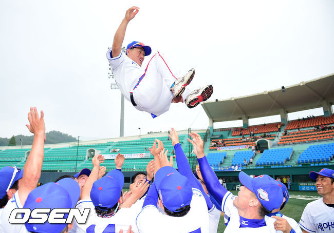경기를 마치고 세아베스틸 최광웅 감독이 헹가래를 받고 있다. / rumi@osen.co.kr