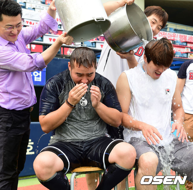 24일 오후 서울 잠실야구장에서 열린 '2014 한국야쿠르트 세븐 프로야구' 두산 베어스와 NC 다이노스의 경기, 경기에 앞서 두산 유희관, 김재호가 아이스버킷챌린지를 하고 있다.