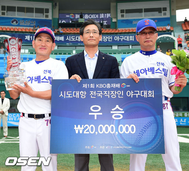 세아베스틸은 24일 군산 야구장에서 열린 ‘제1회 KBO총재배 시도대항 직장인 야구대회’ 결승전에서 19안타의 맹타에 힘입어 19-8로 승리를 거뒀다. 준결승전서 호투를 펼쳤던 에이스 문용두는 이날 경기서도 세종공업 타선을 제압하고 승리투수가 됐다. 이로써 세아베스틸은 올해 처음으로 열린 대회서 챔피언 자리에 올랐다.
