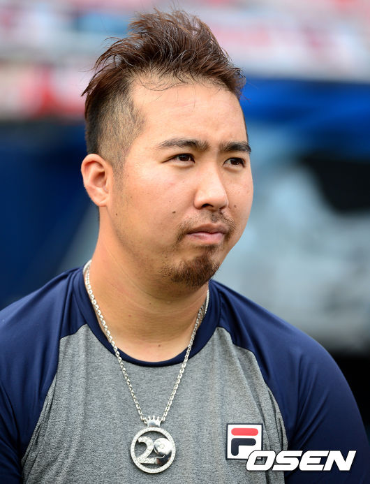 24일 오후 서울 잠실야구장에서 열린 '2014 한국야쿠르트 세븐 프로야구' 두산 베어스와 NC 다이노스의 경기, 경기에 앞서 두산 유희관이 아이스버킷챌린지를 준비하고 있다.