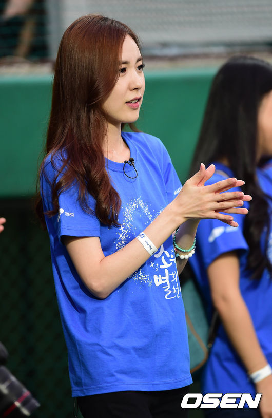 24일 오후 대구 시민구장에서 열린 '2014 한국야쿠르트 세븐 프로야구' 삼성 라이온즈와 SK 와이번스의 경기 시작전 간미연이 그라운드에서 시각장애 학생 공민서 군의 시구를 바라보고 있다. 간미연은 이날 공민서 군과 함께 한 방송 프로그램을 촬영했다.