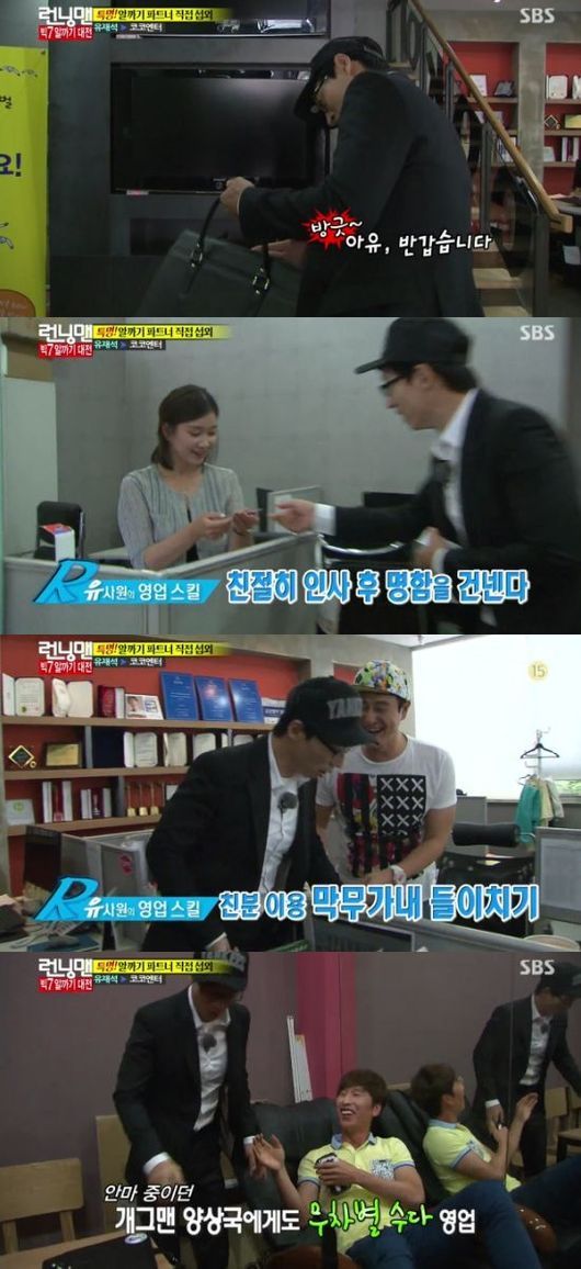 유재석은 24일 오후 방송된 SBS 예능프로그램 '일요일이 좋다-런닝맨'에서 많은 개그맨들이 소속돼 있는 코코엔터테인먼트를 찾아 알까기 시합을 함께 할 파트너를 모집했다.
