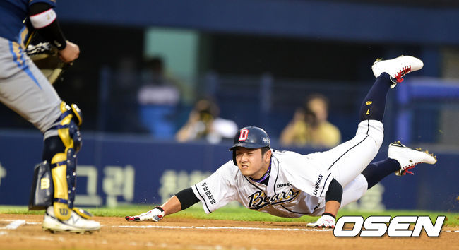 24일 오후 서울 잠실야구장에서 열린 '2014 한국야쿠르트 세븐 프로야구' 두산 베어스와 NC 다이노스의 경기, 1회말 1사 1루에서 두산 최주환이 김현수의 동점 1타점 적시 2루타에 홈에서 슬라이딩하며 세이프되고 있다.