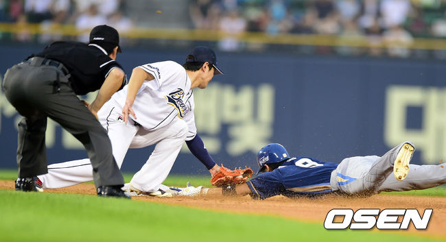 24일 오후 서울 잠실야구장에서 열린 '2014 한국야쿠르트 세븐 프로야구' 두산 베어스와 NC 다이노스의 경기, 2회초 2사 1루에서 NC 김종호가 2루 도루에 실패하고 있다. 두산 2루수는 김재호