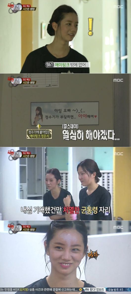 혜리는 24일 오후 방송된 MBC 예능프로그램 ‘일밤-진짜 사나이’에서 체력측정 후 쉬는 시간을 가지다가 정수기에 붙은 에이핑크 멤버의 사진을 발견했다.