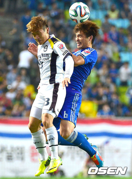 24일 오후 수원시 수원월드컵경기장에서 열린 현대오일뱅크 K리그 클래식 2014 성남FC와 수원 삼성의 경기, 전반 수원 김은선과 김동희가 공중볼을 다투고 있다.
