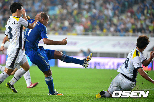 24일 오후 수원시 수원월드컵경기장에서 열린 현대오일뱅크 K리그 클래식 2014 성남FC와 수원 삼성의 경기, 전반 수원 로저가 터닝슛을 시도하고 있다