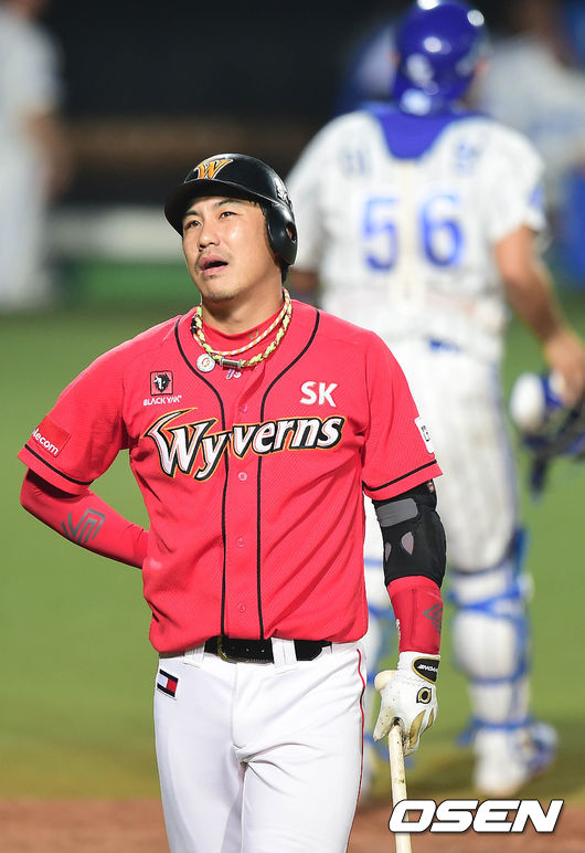 24일 오후 대구 시민구장에서 열린 '2014 한국야쿠르트 세븐 프로야구' 삼성 라이온즈와 SK 와이번스의 경기 5회초 2사 김강민이 헛스윙 삼진을 당하고 덕아웃으로 향하고 있다.
