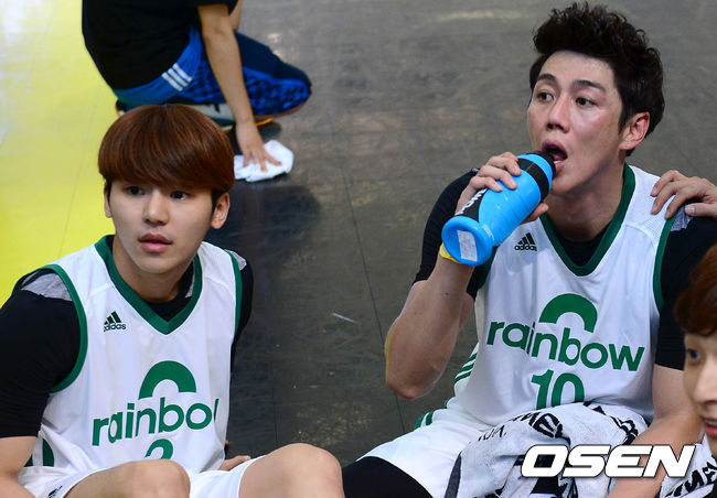 24일 오후 서울 영등포 타임스퀘어 아트리움에서 열린 아디다스 '크레이지코트 2014' 레인보우 연예인 농구팀 vs 제물포 고등학교의 경기, 레인보우 인수와 김혁이 작전을 듣고 있다.