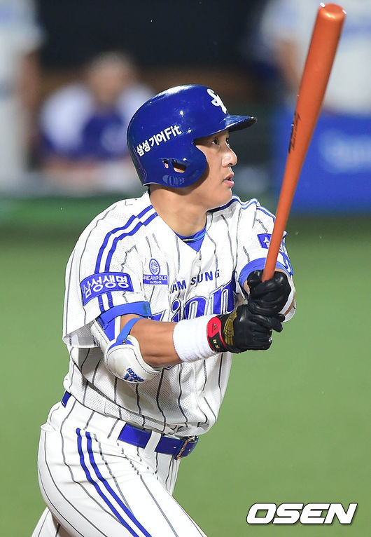 24일 오후 대구 시민구장에서 열린 '2014 한국야쿠르트 세븐 프로야구' 삼성 라이온즈와 SK 와이번스의 경기 5회말 1사 이승엽이 솔로 홈런을 치고 있다.