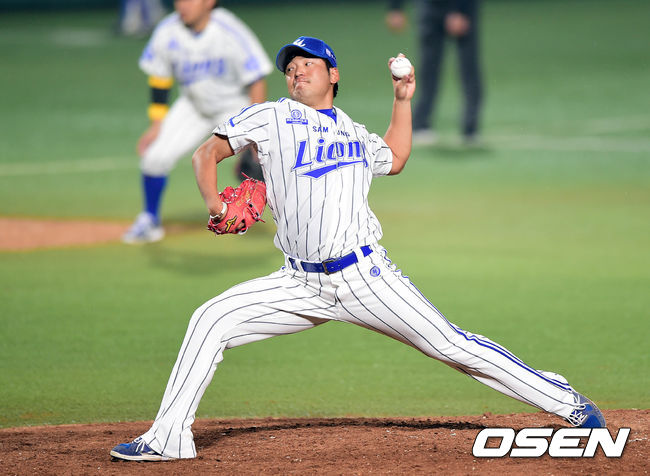 24일 오후 대구 시민구장에서 열린 '2014 한국야쿠르트 세븐 프로야구' 삼성 라이온즈와 SK 와이번스의 경기 6회초 마운드에 올라온 백정현이 역투하고 있다.