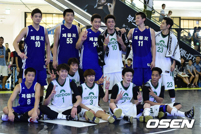 24일 오후 서울 영등포 타임스퀘어 아트리움에서 열린 아디다스 '크레이지코트 2014' 레인보우 연예인 농구팀 vs 제물포 고등학교의 경기, 레인보우의 승리로 경기가 종료된뒤 기념촬영을 하고 있다.