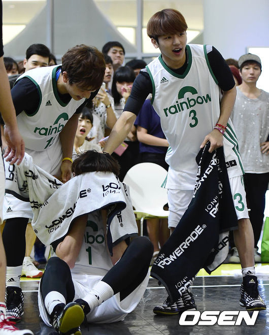 24일 오후 서울 영등포 타임스퀘어 아트리움에서 열린 아디다스 '크레이지코트 2014' 레인보우 연예인 농구팀 vs 제물포 고등학교의 경기, 레인보우 정진운과 인수가 장난을 치고 있다.