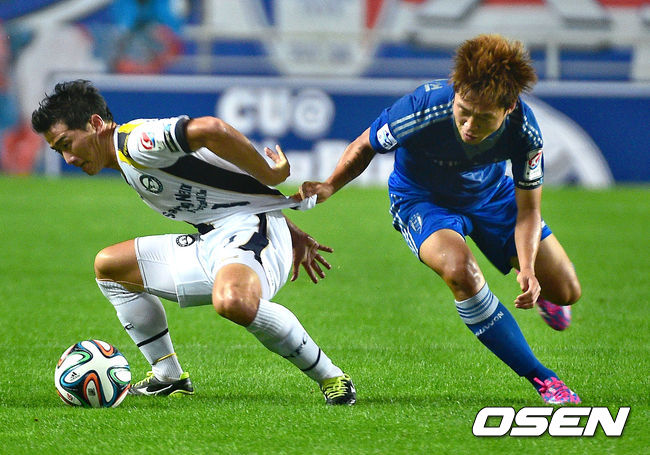 24일 오후 수원시 수원월드컵경기장에서 열린 현대오일뱅크 K리그 클래식 2014 성남FC와 수원 삼성의 경기, 전반 수원 서정진이 성남 박희성의 유니폼을 붙잡고 있다