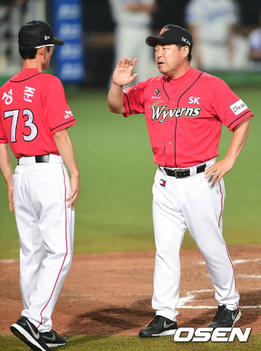 24일 오후 대구 시민구장에서 열린 '2014 한국야쿠르트 세븐 프로야구' 삼성 라이온즈와 SK 와이번스의 경기 6회말 1사 김헌곤의 타구가 2루타 판정이 나자 이만수 감독이 합의판정을 요청하고 있다.