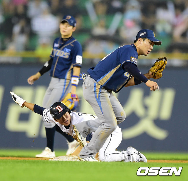 24일 오후 서울 잠실야구장에서 열린 '2014 한국야쿠르트 세븐 프로야구' 두산 베어스와 NC 다이노스의 경기, 6회말 2사 1루에서 두산 허경민이 2루 도루에 성공하고 있다. NC 유격수는 지석훈.