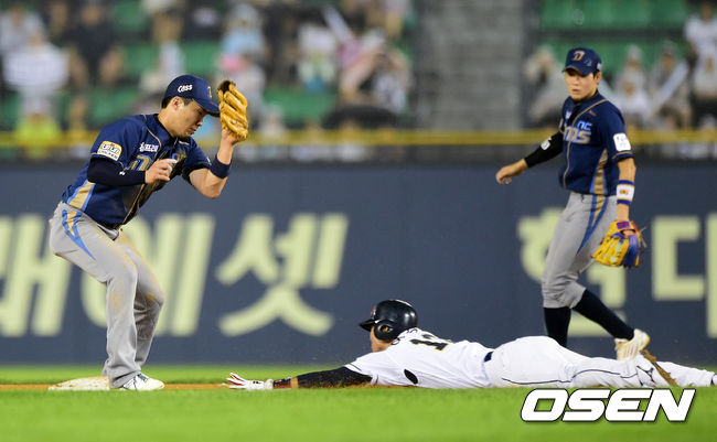 24일 오후 서울 잠실야구장에서 열린 '2014 한국야쿠르트 세븐 프로야구' 두산 베어스와 NC 다이노스의 경기, 6회말 2사 1루에서 두산 허경민이 2루 도루에 성공하고 있다. NC 유격수는 지석훈.