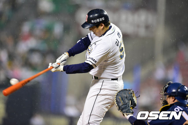 24일 오후 서울 잠실야구장에서 열린 '2014 한국야쿠르트 세븐 프로야구' 두산 베어스와 NC 다이노스의 경기, 7회말 2사에서 두산 김현수가 중전안타를 날리고 있다.