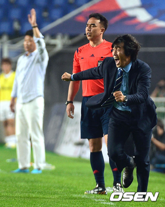 24일 오후 수원시 수원월드컵경기장에서 열린 현대오일뱅크 K리그 클래식 2014 성남FC와 수원 삼성의 경기, 후반 정대세의 헤딩골때 서정원 감독이 기뻐하고 있다. 하지만 오프사이드 판정을 받으며 노골로 선언됐다.