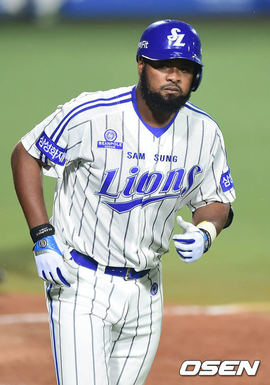 24일 오후 대구 시민구장에서 열린 '2014 한국야쿠르트 세븐 프로야구' 삼성 라이온즈와 SK 와이번스의 경기 7회말 2사 1,2루 나바로가 스리런 홈런을 치고 달리고 있다.