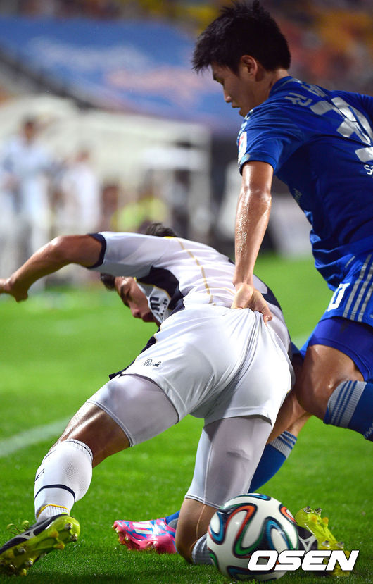 24일 오후 수원시 수원월드컵경기장에서 열린 현대오일뱅크 K리그 클래식 2014 성남FC와 수원 삼성의 경기, 전반 수원 신세계가 성남 박희성의 유니폼을 잡아당기고 있다.