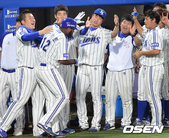 24일 오후 대구 시민구장에서 열린 '2014 한국야쿠르트 세븐 프로야구' 삼성 라이온즈와 SK 와이번스의 경기 7회말 2사 1,2루 나바로가 스리런포를 친 후 덕아웃에서 동료들과 하이파이브를 하고 있다.
