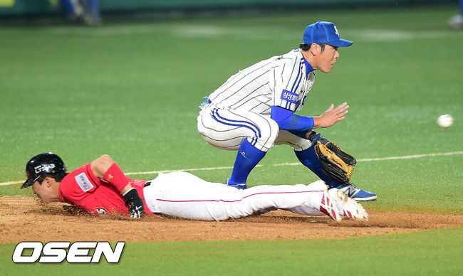 24일 오후 대구 시민구장에서 열린 '2014 한국야쿠르트 세븐 프로야구' 삼성 라이온즈와 SK 와이번스의 경기 8회초 무사 1루 박정권의 중전안타 상황, 1루주자 박계현이 3루까지 진루하고 있다.