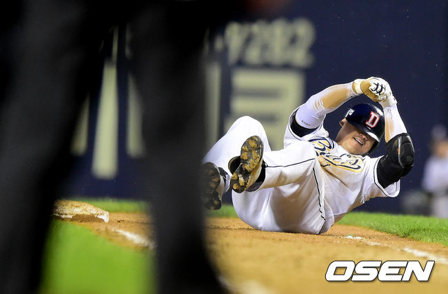 24일 오후 서울 잠실야구장에서 열린 '2014 한국야쿠르트 세븐 프로야구' 두산 베어스와 NC 다이노스의 경기, 8회말 무사에서 두산 홍성흔이 기습번트로 1루에서 헤드퍼스트슬라이딩을 시도했지만 아웃되며 아쉬워하고 있다.